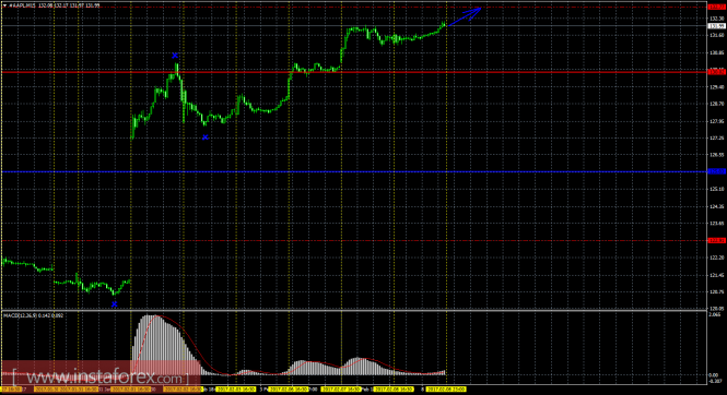 Цена акций Apple продолжает движение вверх. На текущем графике рекомендуется рассматривать длинные позиции с целью 132,77. В случае преодоления этого уровня, таргетом будет выступать 136,54. Закрывать ордера на покупку рекомендуется в случае формирования «медвежьей» модели (с подтверждением), при отскоке цены от уровня 132,77 или при развороте индикатора MACD вниз (может разряжаться). Стоп лосс при торговле на повышение выставляем ниже критической линии 125,83. Ордера на продажу сейчас не актуальны.