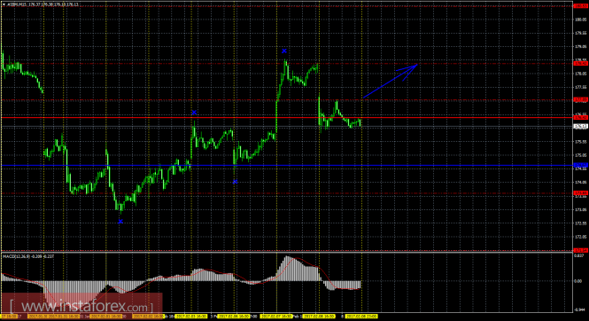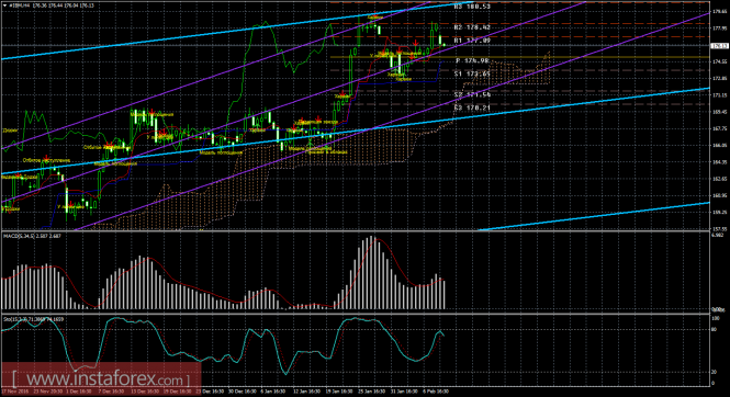 На младшем графике рекомендуется рассматривать ордера на покупку с целью 178,42, при открытии выше Тенкан-сен (176,42), ордером Stop Loss ниже 176,42 и при направленном вверх индикаторе MACD.