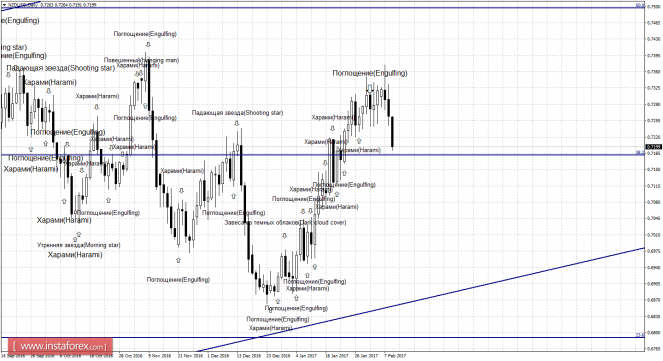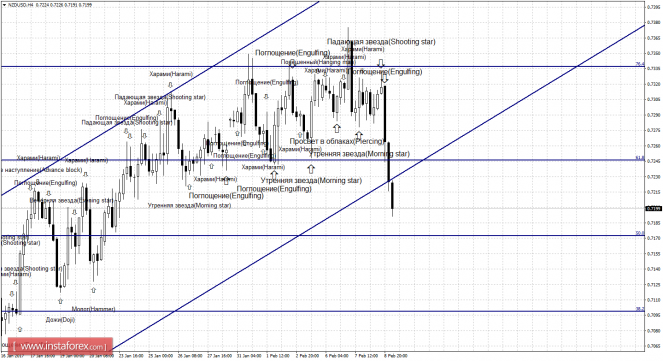 Сразу две сильные медвежьи формации - «Падающая звезда» и «Поглощение» - сработали на 4-часовом графике в пользу американской валюты. В итоге пара выполнила закрепление под уровнем Фибо 61,8% - 0,7246 и продолжает процесс падения в направлении коррекционного уровня 50,0% - 0,7173. Отбой котировок 9 февраля от уровня Фибо 50,0% позволит ожидать разворот в пользу новозеландской валюты и некоторый рост в направлении уровня коррекции 61,8%. Образование бычьей свечной формации аналогично сработает в пользу начала роста котировок. Закрепление курса пары под уровнем Фибо 50,0% повысит вероятность продолжения падения в направлении коррекционного уровня 38,2% - 0,7099.