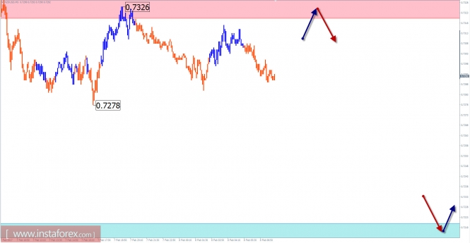 Волновой анализ текущей модели показывает формирование в последние 2 недели скрытой коррекции неправильной формы. Начавшийся 31 января заключительный участок близится к завершению. Выше располагается расчетная зона сопротивления, в которой вероятность смены направления движения пары резко возрастет.