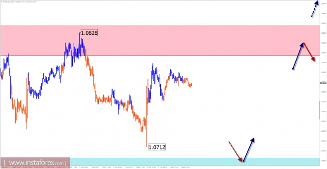 Пояснения к рисункам: Отмеченные на графиках зоны используются как критические участки, в которых значительно повышается вероятность смены направления движения. Чем ближе стрелка к цене на рисунке, тем ранее ожидается ход инструмента в отмеченную сторону. Сплошным фоном стрелок отмечено ожидаемое направление, пунктирным - вероятное.