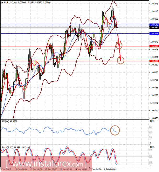 Пара EURUSD торгуется ниже уровня 1.0765 в ожидании публикации данных по занятости из США. Можно предположить, что если они окажутся сильными, то падение цены ниже отметки 1.0735 может привести к ее снижению к 1.0690 или даже к 1.0640.