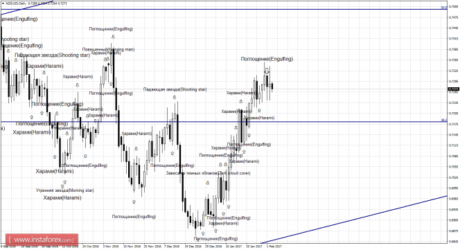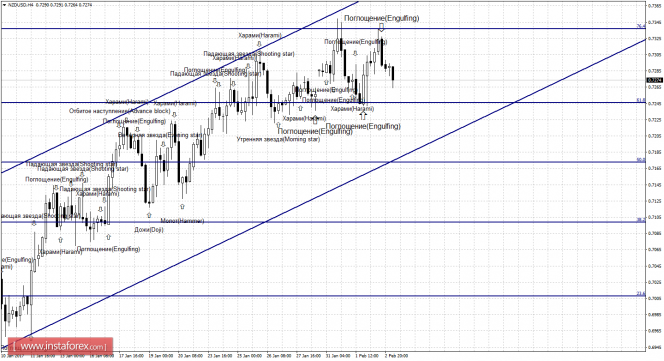 После образования сильной медвежьей формации «Поглощение» (ей предшествовал немалый рост, тело свечи - большое) на 4-часовом графике, котировки выполнили разворот в пользу валюты США и начали падение в направлении коррекционного уровня 61,8% - 0,7246. Отбой котировок 3 февраля от уровня Фибо 61,8% позволит ожидать разворот в пользу валюты Новой Зеландии и некоторый рост в направлении уровня коррекции 76,4% - 0,7337. Образование бычьей свечной формации будет являться трендовым сигналом, исходя из направления равноудаленного канала, и аналогично позволит ожидать некоторый рост. Закрепление котировок под уровнем Фибо 61,8% повысит вероятность продолжения падения в направлении следующего уровня коррекции 50,0% - 0,7172.