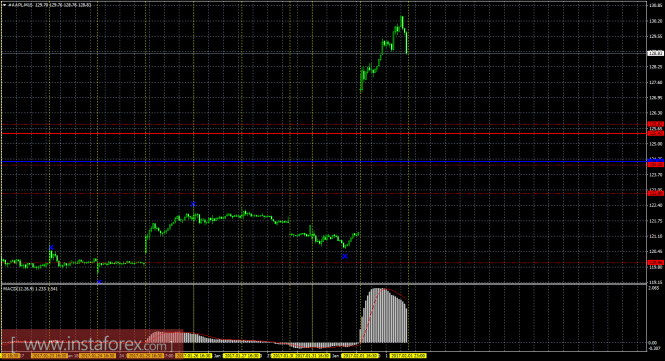 Цена акций Apple продолжает коррекцию. На текущем графике рекомендуется рассматривать длинные позиции. Закрывать ордера на покупку рекомендуется в случае формирования «медвежьей» модели (выполнено, нужно подтверждение) или при развороте индикатора MACD вниз. Стоп лосс при торговле на повышение выставляем ниже критической линии 124,24. Ордера на продажу сейчас не актуальны.