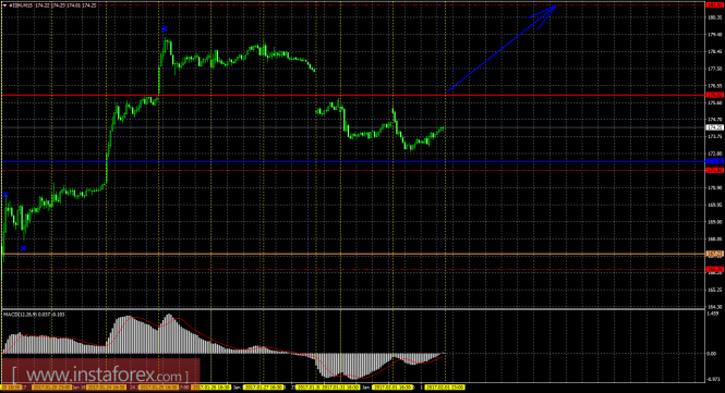 На младшем графике рекомендуется рассматривать ордера на покупку с целью 181,03, при открытии выше Тенкан-сен (176,02), ордером Stop Loss ниже 176,02. MACD при открытии лонгов должен быть направлен вверх.