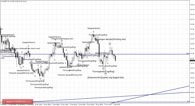 Медвежья свечная формация «Падающая звезда», которая образовалась на 4-часовом графике, априори является сильной и позволила выполнить разворот в пользу японской валюты и выполнить закрепление под коррекционным уровнем 100,0% - 122,00. В итоге падение котировок 2 февраля может быть продолжено в направлении следующего уровня коррекции 76,4% - 119,07. Образование бычьей формации будет являться трендовым сигналом и позволит ожидать разворот в пользу европейской валюты и некоторый роста пары. Закрепление котировок над уровнем Фибо 100,0% сработает в пользу дальнейшего роста.
