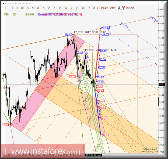 Развитие движения цены инструмента (#CL) в период 31 января - 02 февраля 2017 г. будет обусловлено отработкой границ канала 1/2 Median Line (52.10 <-> 52.25 <-> 52.40) вил операционного масштаба Micro.