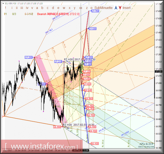 Развитие движения цены инструмента (Silver Spot) в период 31 января - 02 февраля 2017 г. будет обусловлено отработкой границ зоны равновесия (17.000 <-> 17.090 <-> 17.190) вил операционного масштаба SubMinuette и канала 1/2 Median Line (17.050 <-> 17.120 <-> 17.255) вил операционного масштаба Micro.