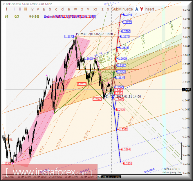 Развитие движения цены инструмента (GBP/USD) в период 31 января - 02 февраля 2017 г. будет обусловлено отработкой границ канала 1/2 Median Line Micro (1.2485 <-> 1.2495 <-> 1.2505) и зон равновесия вил операционных масштабов -> SubMinuette (1.2495 <-> 1.2537 <-> 1.2577) и Micro (1.2537 <-> 1.2555 <-> 1.2577).