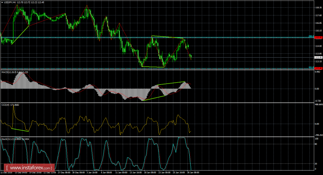 После образования медвежьей дивергенции котировки на 4-часовом графике выполнили разворот в пользу валюты Японии и продолжают сейчас падение в направлении коррекционного уровня Фибо 161,8% - 112,40. Медвежья дивергенция у индикатора MACD: последний пик котировок получился ниже предыдущего, а аналогичный пик индикатора - выше предыдущего. Новых назревающих дивергенций 31 января нет. Отбой котировок от уровня коррекции 161,8% позволит трейдерам ожидать разворот в пользу доллара США и некоторый рост в направлении уровня коррекции 200,0% - 115,42. Закрепление пары под уровнем Фибо 161,8% повысит шансы на дальнейшее падение в направлении следующего уровня коррекции 100,0% - 107,52.