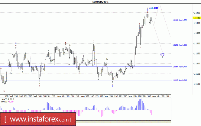 Валютная пара возобновила построение волны (B), которая теперь приняла более сложный вид. Сейчас ожидается повышение котировок в рамках волны с, в с, в с, в Е, в (В) с целями, расположенными около 15 фигуры. После завершения построения всей волны E, в (B) ожидается снижение с первыми целями, расположенными около расчетных отметок 1,1291 и 1,1184, что приравнивается к 100,0% и 76,4% по Фибоначчи.Материал предоставлен компанией InstaForex - www.instaforex.comТорговый план 03 - 07.07.2017
