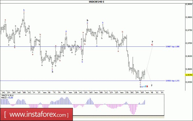 Инструмент продолжает построение волны Е, в С, в (В). В рамках построения волны с, в с, в Е, в С, в (В), повышение котировок может возобновиться с целями, находящимися около расчетных отметок 112,89 и 114,51, что соответствует 23,6% и 100,0% по Фибоначчи. После завершения построения этой волны инструмент может перейти в стадию длительного снижения в рамках волны (С).Материал предоставлен компанией InstaForex - www.instaforex.comВолновой анализ валютной пары USD/CHF за 3 июля 2017 года