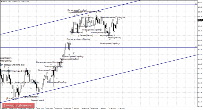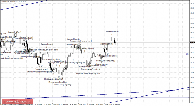 Медвежья свечная формация «Харами», образовавшаяся на 4-часовом графике, позволила паре прекратить рост котировок, выполнить разворот в пользу валюты Японии и начать падение в направлении уровня Фибо 100,0% - 122,00. Образование бычьей формации 30 января позволит ожидать разворот в пользу европейской валюты и некоторый рост в направлении коррекционного уровня 161,8% - 129,72. Отбой пары от уровня Фибо 100,0% аналогично сработает в пользу валюты ЕС. Закрепление курса под уровнем коррекции 100,0% повысит шансы на продолжение падения в направлении уровня Фибо 76,4% - 119,04.