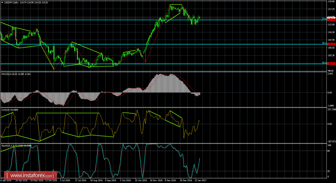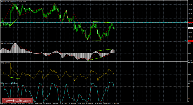 Котировки пары на 4-часовом графике выполнили возврат к уровню Фибо 200,0% - 115,42, но после образования медвежьей дивергенции выполнили разворот в пользу японской иены и начали падение в направлении коррекционного уровня 161,8% - 112,40. Медвежья дивергенция у индикатора MACD: последний пик котировок получился ниже предыдущего, а аналогичный пик индикатора – выше предыдущего. Новых назревающих дивергенций 30 января нет. Закрепление курса пары над уровнем Фибо 200,0% сработает в пользу американского доллара и возобновления роста в направлении уровня коррекции 261,8% - 120,37.