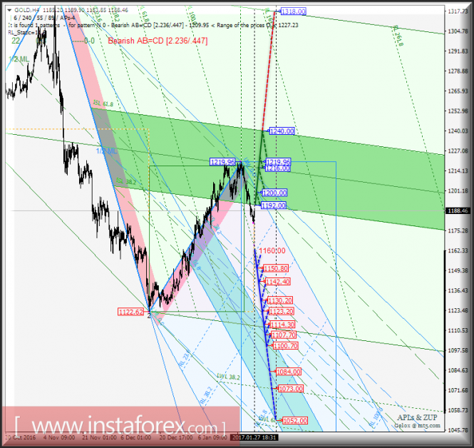 Развитие движения цены инструмента (Gold Spot) в период 30 января - 13 февраля 2017 г. будет обусловлено отработкой нижней границы ISL38.2 (уровень сопротивления 1192.00) зоны равновесия вил операционного масштаба Minute и линии реакции RL23.6 (уровень поддержки 1160.00) вил операционного масштаба Minuette.