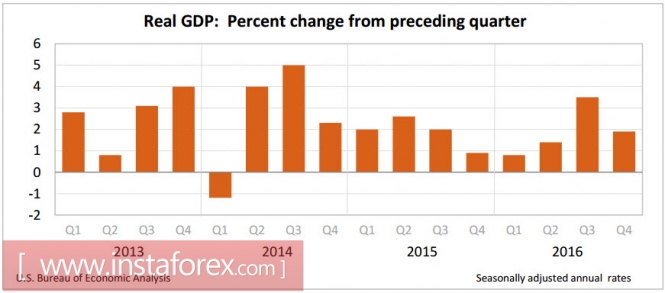 2017-01-28 01:08:24 (читать в оригинале)Первые предварительные данные о темпах роста ВВП США в 4 квартале оказались несколько хуже ожиданий, рост составил 1.9% в годовом исчислении против 3.5% в 3 квартале, эксперты прогнозировали 2.2%.