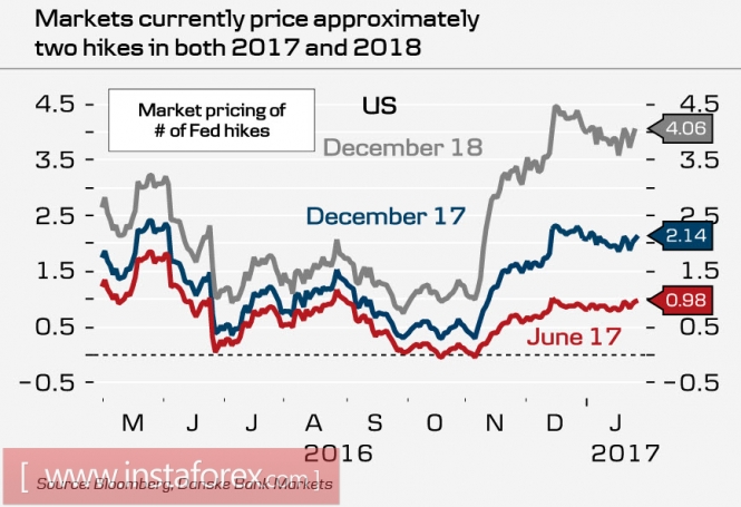 Также в среду состоится заседание FOMC. Поскольку оно не будет сопровождаться публикацией обновленных макроэкономических прогнозов и пресс-конференцией, то рынки будут под микроскопом изучать сопроводительное заявление, в частности, изменение оценки относительно «Трампономики» и возможное исчезновение идеи смягчения позиции Комитета относительно будущих перспектив. Рынки на данный момент склоняются к тому, что в 2017 г. состоится два повышения ставки с небольшим риском трех подходов, а в 2018 г. – еще два, такие темпы волне достаточны, чтобы поддерживать спрос на доллар на высоком уровне.