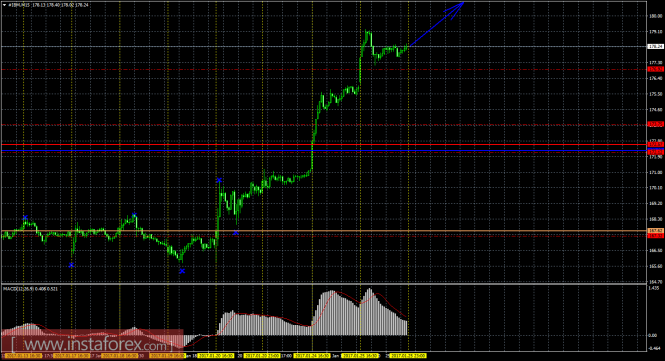 На младшем графике рекомендуется рассматривать ордера на покупку, при открытии выше 176,92, ордером Stop Loss ниже 176,92. Разворот MACD вверх может указать на продолжение восходящего движения.