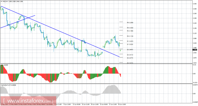 Красная линия и гистограмма с белыми барами в окне индикаторов.Материал предоставлен компанией InstaForex - www.instaforex.comТехнический анализ природного газа за 3 июля 2017 года
