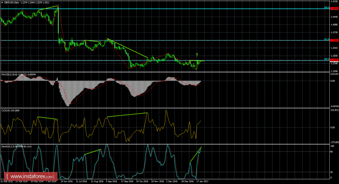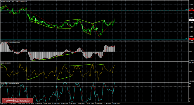 Без образования бычьей дивергенции котировки на 4-часовом графике выполнили разворот в пользу английского фунта стерлингов и возобновили процесс роста в направлении уровня коррекции 200,0% - 1,2652. Назревающих дивергенций 23 января не наблюдается ни у одного индикатора. Отбой курса от уровня Фибо 200,0% позволит трейдерам ожидать разворот в пользу валюты США и некоторое падение в направлении коррекционного уровня 261,8% - 1,1926. Закрепление котировок над уровнем коррекции 200,0% сработает в пользу продолжения роста в направлении уровня Фибо 161,8%.