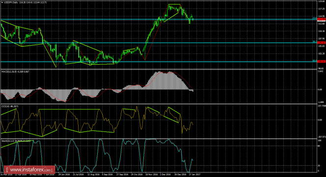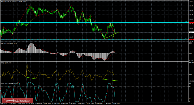 На 4-часовом графике пара выполнила отбой от уровня коррекции 200,0% - 115,42 и разворот в пользу японской иены. 23 января назревает бычья дивергенция у индикатора CCI: последний лоу котировок может получиться выше предыдущего, а аналогичный лоу индикатора - уже ниже предыдущего. Бычья дивергенция позволит ожидать разворот в пользу американского доллара и некоторый рост в направлении коррекционного уровня 200,0%. Отбой котировок от уровня Фибо 161,8% аналогично сработает в пользу валюты США. Закрепление пары под уровнем коррекции 161,8% повысит шансы на продолжение падения в направлении следующего коррекционного уровня 100,0% - 107,52.