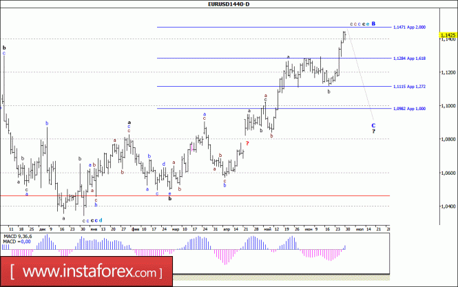 Фунт стерлингов продолжает построение протяженной восходящей коррекции. На этой неделе ожидается повышение котировок в рамках волны 5, в 3 или С с целями, расположенными около отметок 1,3024 и 1,3273, что соответствует 127,2% и 161,8% по Фибоначчи. Волна 4, в 3 или С завершила свое построение. Повышательный коридор сохраняет перспективы повышения котировок.Материал предоставлен компанией InstaForex - www.instaforex.comВолновой анализ валютной пары EUR/USD. Недельный обзор
