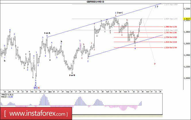 Волновая разметка инструмента предполагает построение усложненной волны е, в С, в С, в (В). Инструмент может продолжить снижение с целями, расположенными вблизи расчетной отметки 0,9555, что приравнивается к 127,2% по Фибоначчи, и ниже, около 94 фигуры. После завершения построения этой волны ожидается протяженной повышение котировок в рамках предполагаемой волны (С).Материал предоставлен компанией InstaForex - www.instaforex.comВолновой анализ валютной пары GBP/USD. Недельный обзор