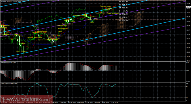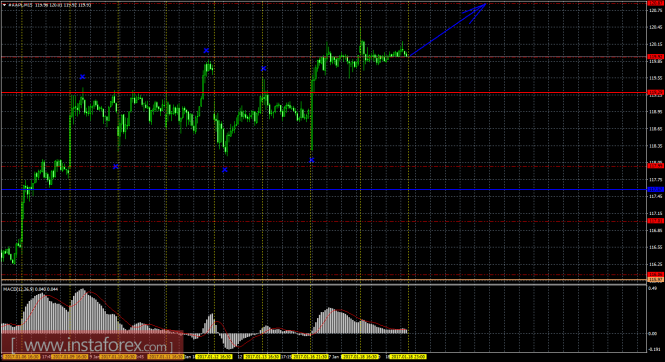 На 15-минутном графике рекомендуется рассматривать ордера на покупку с целью 120,87, при закреплении цены выше 119,92, ордером Stop Loss ниже 119,92 и при направленном вверх MACD.