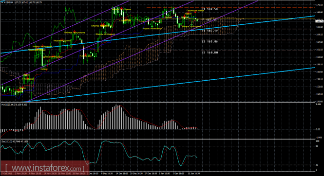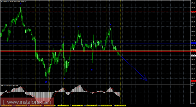 На младшем графике рекомендуется рассматривать ордера на продажу с целью 165,19, при открытии ниже Тенкан-сен (167,05), ордером Stop Loss выше 167,59 (Киджун-сен) и при направленном вниз индикаторе MACD.