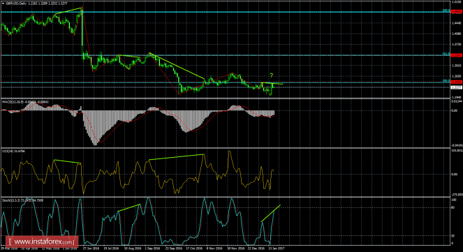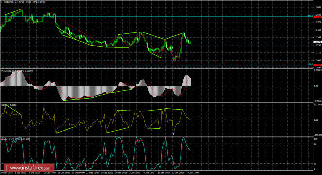 После образования медвежьей дивергенции на 4-часовом графике пара выполнила разворот в пользу американской валюты и начала процесс падения в направлении уровня коррекции 261,8% - 1,1926. Медвежья дивергенция у индикатора CCI: последний пик котировок получился выше предыдущего, а аналогичный пик индикатора - ниже. Проход парой 19 января последнего дивергенционного пика сработает в пользу английской валюты и возобновления роста в направлении коррекционного уровня 200,0% - 1,2652.