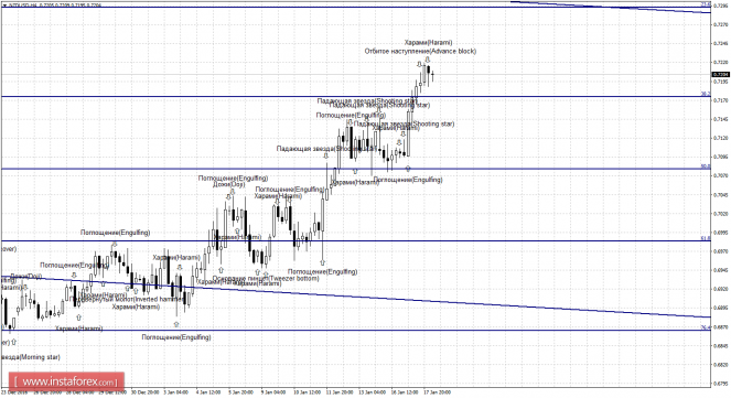Бычья свечная формация «Поглощение», образовавшаяся на 4-часовом графике, позволила котировкам выполнить разворот в пользу валюты Новой Зеландии и закрепление над уровнем коррекции 38,2% - 0,7175. После этого были образованы две медвежьи формации - «Отбитое наступление» и «Харами», которые позволили котировкам выполнить разворот в пользу доллара США и начать процесс возврата к уровню Фибо 38,2%. Образование 18 января новой бычьей формации вновь сработает в пользу новозеландской валюты и возобновления роста в направлении коррекционного уровня 23,6% - 0,7293. Закрепление котировок под уровнем Фибо 38,2% повысит шансы на дальнейшее падение в направлении уровня коррекции 50,0% - 0,7079.