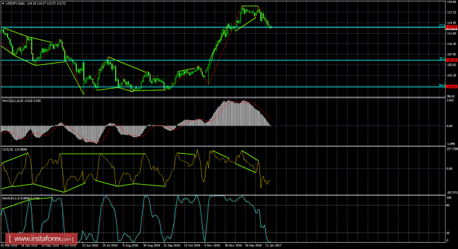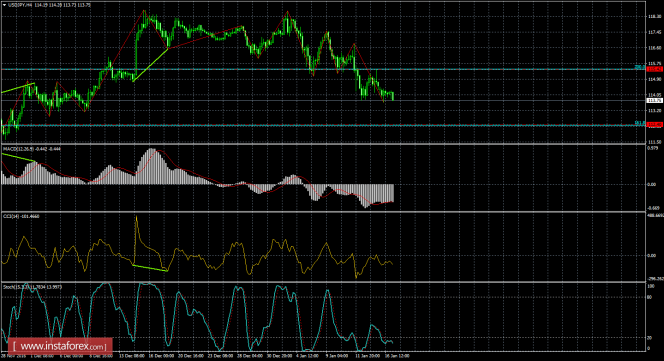 На 4-часовом графике падение котировок также продолжается в направлении уровня коррекции 161,8% - 112,40. Назревающих дивергенций 17 января ни у одного индикатора не наблюдается. Отбой котировок от уровня Фибо 161,8% позволит трейдерам рассчитывать на разворот пары в пользу американской валюты и некоторый рост в направлении коррекционного уровня 200,0% - 115,42. Закрепление курса пары под уровнем Фибо 161,8% повысит вероятность дальнейшего падения в направлении следующего уровня коррекции 100,0% - 107,52.