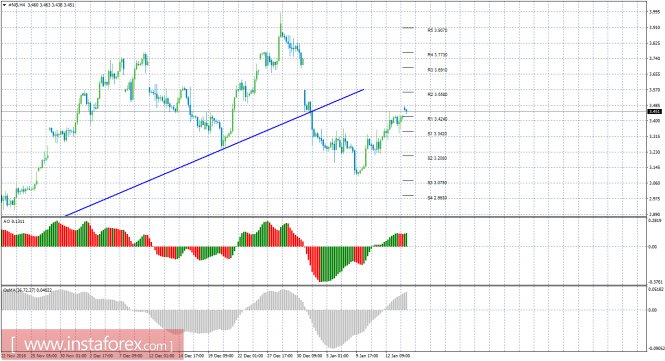 Анализ природного газа за 16 января показывает, что цена в начале новой недели находится между уровнями S1 и R1 и не определилась с направлением движения. На данный момент актуально нисходящее движение с целями уровни поддержки S2 – 3,2460 и S3 – 3,1130, если цена закрепится ниже 3,3800. Целями для продолжения восходящей коррекции выступают уровни 3,5960 и 3,7290, если цена преодолеет 3,4620. Цена закрепилась ниже восходящей линии тренда, поэтому сейчас актуальными являются ордера на продажу, а тенденция изменилась на нисходящую. Нисходящей линии тренда на данный момент нет. Индикатор Awesome показывает локальное восходящее движение, последний закрытый бар окрашен в зеленый цвет. OsMA также направлен вверх, что сигнализирует о восходящем движении цены на газ и в более долгосрочном плане.