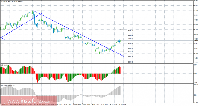 Уровни поддержки и сопротивления – красные горизонтальные линии.Материал предоставлен компанией InstaForex - www.instaforex.comТехнический анализ сырой нефти за 30 июня 2017 года