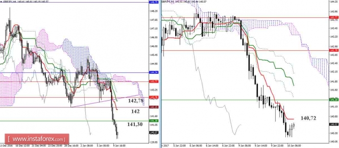 В настоящий момент младшие таймфреймы полностью на стороне медведей. Цели и ориентиры здесь давно отработаны, поэтому все перспективы снижения сейчас расположены на старших временных интервалах. Н4 и Н1 смогут пригодиться в случае развития коррекционного подъёма, сформировав дополнительные уровни сопротивления. Сопротивления различных уровней Ишимоку сегодня сконцентрированы на следующих рубежах: 140,72 (Тенкан Н1) – 141,30 (Тенкан недель + крест Н1) – 142 (Тенкан Н4 + прошлый максимум) – 142,78 (дневной Тенкан + крест Н4 + облако Н1).
