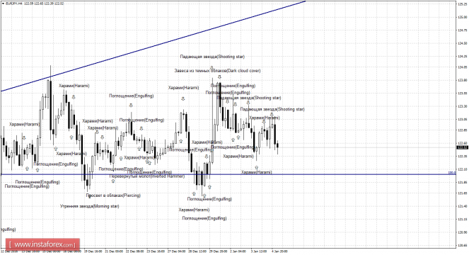 Первая «медвежья» формация «Харами», образовавшаяся на 4-часовом графике, позволила паре выполнить некоторое падение. После образования второй «медвежьей» свечной формации «Падающая звезда» котировки вновь выполнили разворот в пользу японской иены и начали падение в направлении коррекционного уровня 100,0% - 122,00. Образование 5 января «бычьей» формации будет являться трендовым сигналом, исходя из направления равноудаленного канала вверх, и позволит ожидать разворота в пользу валюты ЕС и некоторого роста в направлении уровня коррекции 161,8% - 129,70. Отбой котировок от уровня Фибо 100,0% аналогично сработает в пользу начала роста пары. Закрепление под уровнем коррекции 100,0% повысит шансы на дальнейшее падение в направлении следующего уровня Фибо 76,4% - 119,05.
