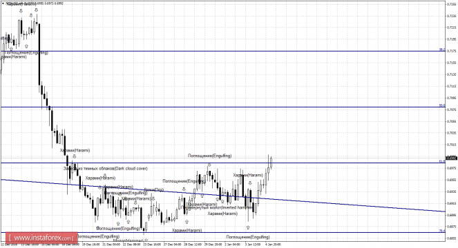 Без образования «бычьей» свечной формации на 4-часовом графике пара выполнила разворот в пользу новозеландской валюты и показала рост к уровню коррекции 61,8% - 0,6984. Отбой котировок от уровня Фибо 61,8% 5 января позволит трейдерам ожидать разворота в пользу валюты США и некоторого падения в направлении коррекционного уровня 76,4% - 0,6865. Образование «медвежьей» формации будет трактоваться как трендовый сигнал (равноудаленный канал имеет направление вниз) и повысит шансы пары на отбой от уровня Фибо 61,8%. Закрепление котировок над уровнем коррекции сработает в пользу дальнейшего роста в направлении следующего уровня Фибо 50,0% - 0,7079.