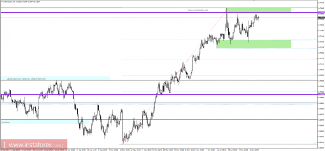 2017-06-26 09:58:36 (читать в оригинале)На четырехчасовом графике мы можем наблюдать за восходящим движением, где котировка уперлась в сильный уровень сопротивления 0,7300 и как факт образовала широкое боковое движение. Сейчас мы видим, как покупатели в очередной раз образовали скопление возле уровня, проявляя малую волатильность. Вероятно предполагать, что "медведи" вновь постараются перевернуть котировку, отрабатывая уровень и возвращая нас к значениям 0,7240/0,7200.
