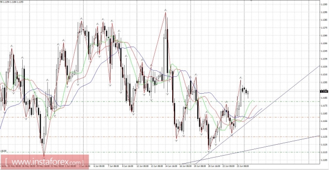 Анализ рынка Форекс по паре евро/доллар за 27 июня показывает, что цена отработала верхнюю границу облака Ишимоку и не смогла ее преодолеть с первого раза. Текущий сигнал на покупку является подтвержденным и слабым, так как Чинкоу Спан закрепился выше графика цены, а цена располагается внутри облака Ишимоку. На данный момент целью для восходящего движения является первый уровень сопротивления 1,1231, но рассматривать лонги можно будет только выше облака. В случае преодоления этой цели, новым таргетом будет выступать уровень сопротивления 1,1268. Восходящее движение является актуальным до тех пор, пока цена находится выше линии Киджун-сен (1,1175). Если цена закрепится ниже критической линии, это ослабит «золотой крест» до предела, восходящее движение – будет отменено, движение вниз сможет возобновиться с целью первый уровень поддержки 1,1137. Боллинджер Бандс показывает продолжение восходящего движения, полосы расширяются и направлены наверх, поэтому сейчас на рынке рекомендуется рассматривать варианты длинных позиций, но после усиления сигнала от Ишимоку. MACD развернулся вниз, что свидетельствует о витке коррекционного движения. Разворот индикатора наверх укажет на окончание коррекции. Отскок цены от критической линии также может спровоцировать возобновление движения вверх. Волатильность по паре EUR/USD сейчас невысокая, амплитуда равна всего 48 пунктам.