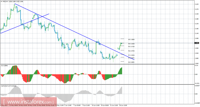 Красная линия и гистограмма с белыми барами в окне индикаторов.Материал предоставлен компанией InstaForex - www.instaforex.comТехнический анализ природного газа за 27 июня 2017 года