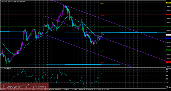 Хайкен Аши – индикатор, окрашивающий бары в голубой или фиолетовый цвета.Материал предоставлен компанией InstaForex - www.instaforex.comТехническая картина инструмента GOLD по системе «Каналы регрессии» за 26 июня 2017 года