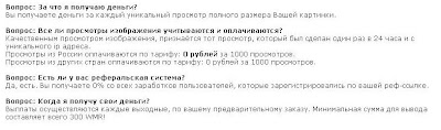 Ноль рублей за любые просмотры. Ноль рублей реферальских. Минималка для вывода всего 300 электронных рублей. Ну а что, зато честно. Регистрироваться и заморачиваться с этим фотохостингом я не стал. Даже если это глюк системы, все равно лучше перестраховаться. Кстати, если кто ищет заработок в интернете, то можно заработать разными способами, к примеру, у меня вверху блога висит баннер Ротапоста. Можно зарабатывать там, если умеете связать пару слов. Только нужно работать, халявы нет.