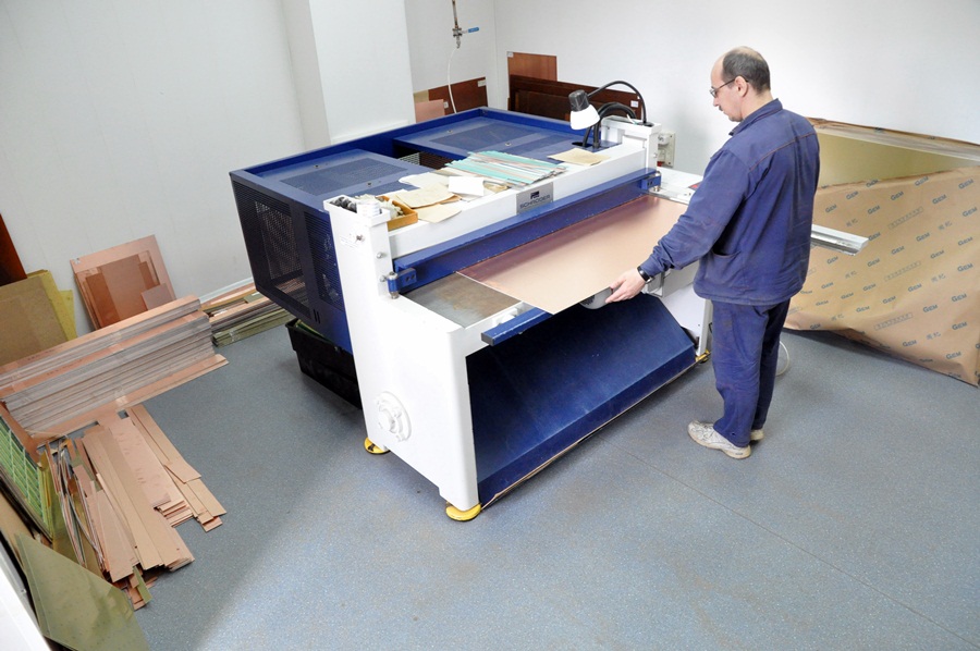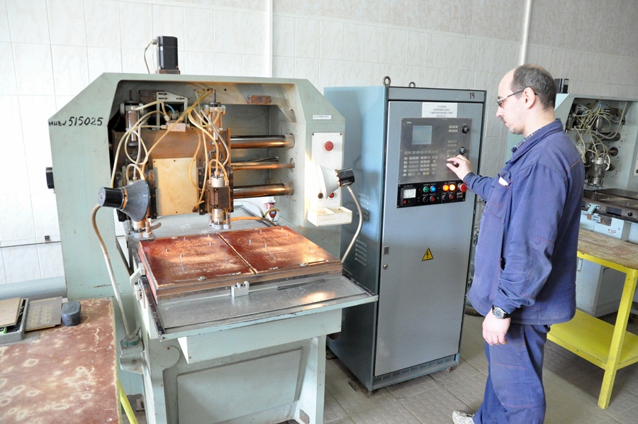 Штамповка. Здесь вырубают контур простых плат и нарубают заготовки.