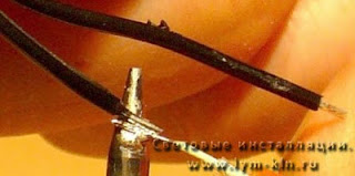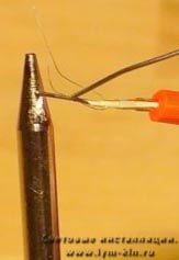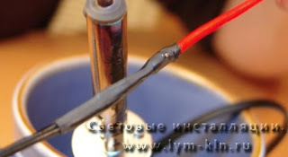 ![]() | Теперь Вы будете подключать два тонких железных электрода к длинному концу медного провода ( к которому, как Вы помните присоединен штекер). Это потребует активные манипуляции! Обмотаем два электрода гибкого неона вокруг длинного конца медного провода. Это очень сложная работа, и может потребоваться несколько попыток. Применим чуть-чуть припоя и прикоснемся к жалу паяльника. Очень быстро, припой будет обтекать электроды ( они луженые уже на заводе) с длинным концом медного провода ( который как мы помним, подсоединен к шекер). |
