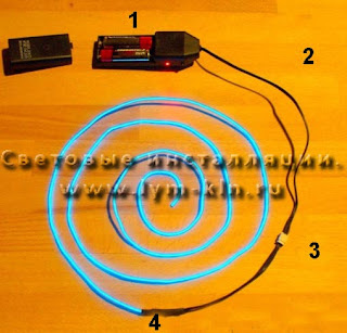 ![]() | Вверху картинки - источник питания (батарейки) подключенные к инвертору (драйверу, блоку питания). (1). Блок питания с холодным неоном разъемом (2). Гибкий неон будет подключен через разъем к инвертору. Это позволит в любое время менять кусочки гибкого неона.(3). Соединение неонового шнура с разъемом (4). Что Вам нужно: