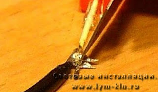 ![]() | Термоусадочную трубку, Вы надели и подвинули к области пайки !Теперь вы должны нагреть ее. Есть ну очень простой метод . Использование паяльника - прикасаемся термотрубкой к паяльнику, но не к жалу!!! Вращайте, чтобы предотвратить горение. Постепенно, темоусадочная трубка будет очень нежно но прочно, уменьшаться в размерах и надежно зафексирует сорединение! |