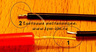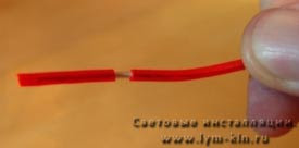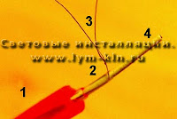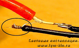 ![]() | Соединение холодного неона с обычным проводом - состоит в свою очередь, из двух паяных соединений. Центральная жила должна быть припаяна к короткому кусочку провода (1). Затем, два тонких провода (их необходимо скурить в косичку) должны быть припаяны к длинному кусочку провода (2). Такое соединение (в шахматном порядке) позволит предотвратить короткое замыкание. Это очень важно! |