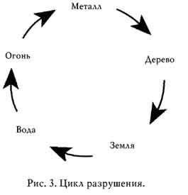 Цикл уничтожения элементов происходит в ином порядке: дерево наносит вред почве (корни разрушают землю), почва препятствует воде (впитывая ее), вода гасит огонь, огонь разрушает металл, а металл рубит дерево.