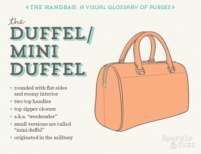 Более крупный и функциональный вариант сумки-цилиндра. Изначально это была спортивная сумка или сумка для путешествий. Тем не менее, классический дюффель в уменьшенном размере часто можно встретить в руках у городских дам и в качестве повседневной сумки.
