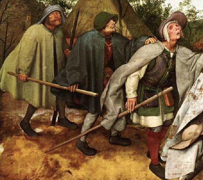 Вот они пред нами. Их лица обращены к небу, словно они там что-то видят. Их пятеро. Каждый держит руку на плече впереди идущего. Последний совершенно спокоен, как будто спит на ходу.Одной рукой при помощи палки он ощупывает землю. Другой - придерживает палку покороче, которую сжимает и тот, кто идет впереди. У этого, идущего впереди, зеленая шляпа, к его поясу привязаны литавры, на груди , поверх красной рубахи виднеется нитка бус с Распятием. На лице гримаса беспокойства, видимо оттого, что его рука лишь скользит по плечу идущего впереди. Этот, в свою очередь, запрокинув голову с пустыми глазницами, разинув от усилия рот, пытается удержать плечо четвертого, с бельмами на глазах. Четвертый уже спотыкается, потому что не отпустил палку, которую держит пятый, падающий, обращенный к нам пустыми глазницами. Еще одно мгновение и он присоединится к тому, который уже свалился в канаву и чья виола уже лежит в грязи.